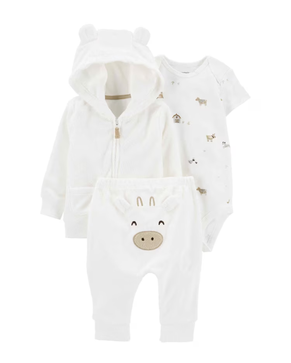 Pensado especialmente para dias mais gelados, o Conjunto longo bebê 3 peças fazendinha branco | Carter’s é a pedida ideal para deixar seu bebê bem aquecido. O conjunto conta com 1 body com estampa de fazendinha, 1 calça com cós elástico e estampa de vaquinha, 1 jaqueta com mangas longas, abertura frontal por zíper e capuz com orelhinhas. Super aconchegante e quentinho, o conjunto vai proteger o seu bebê e ele ainda vai ficar uma gracinha!