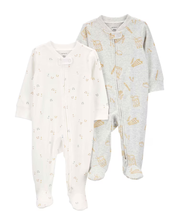 No ritmo da fofura! O Kit macacão bebê 2 peças instrumentos e notas musicais multicor | Carter’s feito de algodão, unissex, possui dois macacões com fechamento por zíper inverso com martingale, protegendo os dedinhos de seu baby, com pezinho e estampado com notas e instrumentos musicais. Ele ficará ainda mais charmoso. Aposte!